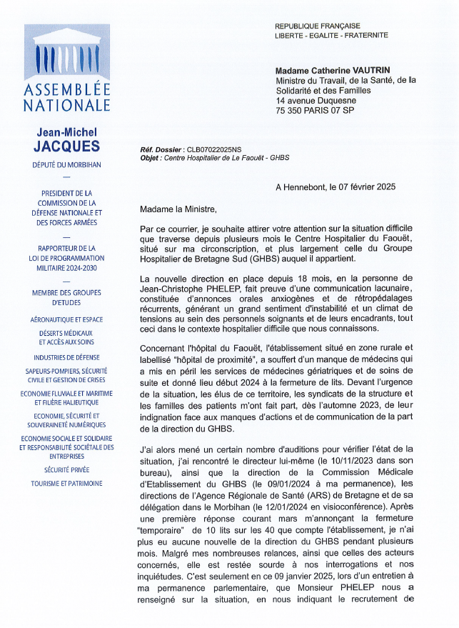 J’ai adressé ce vendredi 7 février un courrier à l’attention de Madame Catherine VAUTRIN, ministre du Travail, de la Santé, de la Solidarité et des Familles, dans lequel il dénonce la communication lacunaire de Jean-Christophe PHELEP, directeur du Groupe Hospitalier de Bretagne Sud (GHBS) et appelle la ministre à prendre des mesures pour garantir une gestion plus transparente et respectueuse des besoins des patients et des personnels hospitaliers.