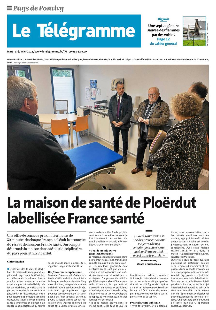 Article du Télégramme du 26 janvier : https://www.letelegramme.fr/morbihan/ploerdut-56160/ici-on-est-dans-le-match-la-maison-de-sante-pluridisciplinaire-de-ploerdut-labellisee-france-sante-6972413.php